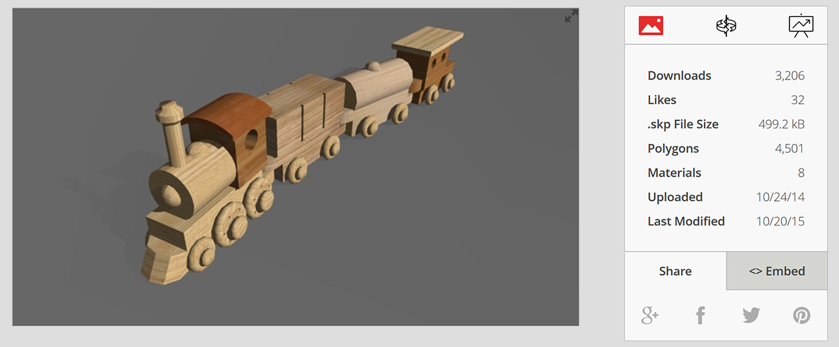 Im 3D Warehouse von Google lässt sich eine exakte Nachbildung des Spielzeugs finden. Das volltexturierte Modell besteht aus 4500 Polygonen und 32 einzelnen, kleinen Holztexturen.