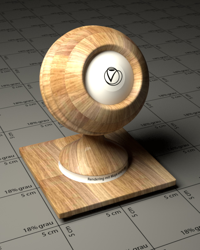 Durch den fbx-Export aus Sketchup liegen die Shader der Szene als Maya-Phong-Shader mit falschen Reflexions-Einstellungen vor und müssen daher zunächst zu einem VRayMtl umgewandelt werden. Die leichte Unschärfe der Texturen durch die geringe Auflösung ist im späteren Rendering durch die entsprechende Entfernung der Kamera nicht mehr zu sehen. Auf unterschiedliche Materialien für die unterschiedlichen Hölzer wird außerdem verzichtet und nur ein gemeinsamer Shader für alle Holzarten und Texturen verwendet.