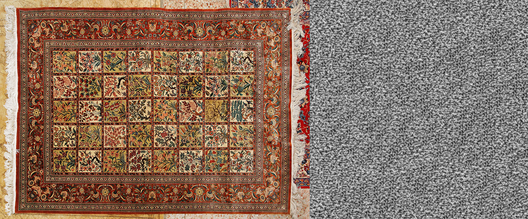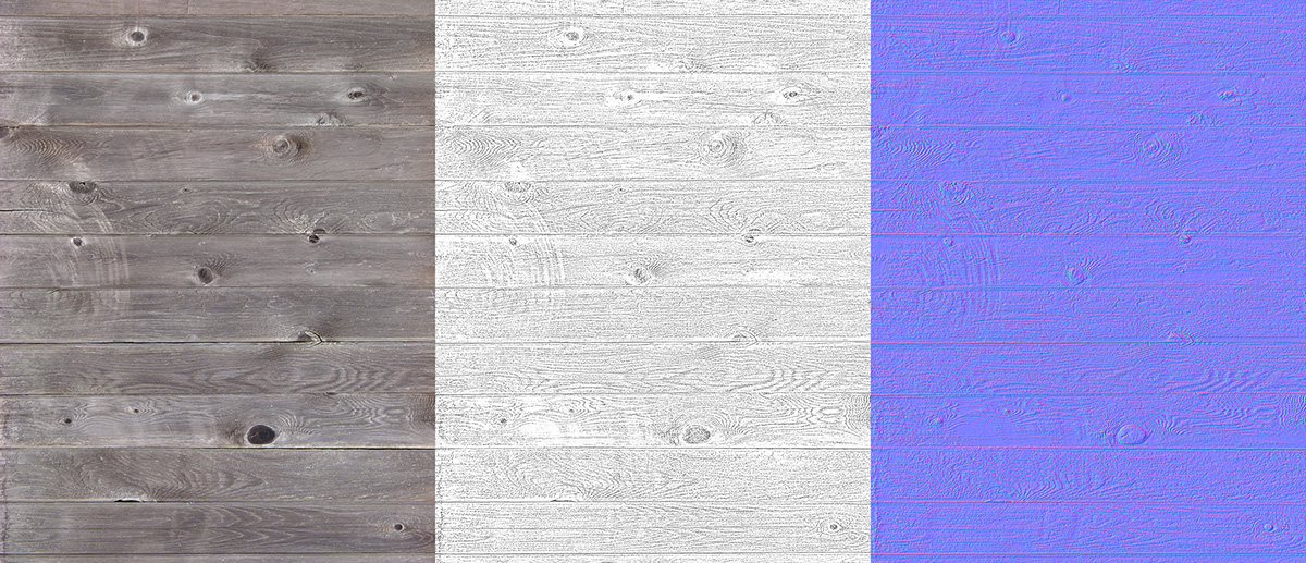 Für den Fußboden, auf dem der Teppich liegt, wird eine hochauflösende Fotografie eines dunklen Holzbodens verwendet. Aus der Textur wird ein Graustufenbild für die Reflexions-Eigenschaften sowie eine Normal Map für das Bump Mapping erzeugt.
