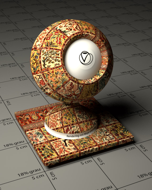 Für den Teppichboden, auf dem der Zug steht, wird ein Shader als VRayMtl angelegt, der seine Farbinformation aus einer Fotografie eines Teppichs zieht. Um die unebene Oberfläche eines Teppichs zur Geltung zu bringen, wird eine Graustufen-Textur als Bump Mapping-Vorlage verwendet. Mit einer Bump-Tiefe von 0.012 und ohne Reflexion erzeugen wir die typische Oberflächenstruktur.