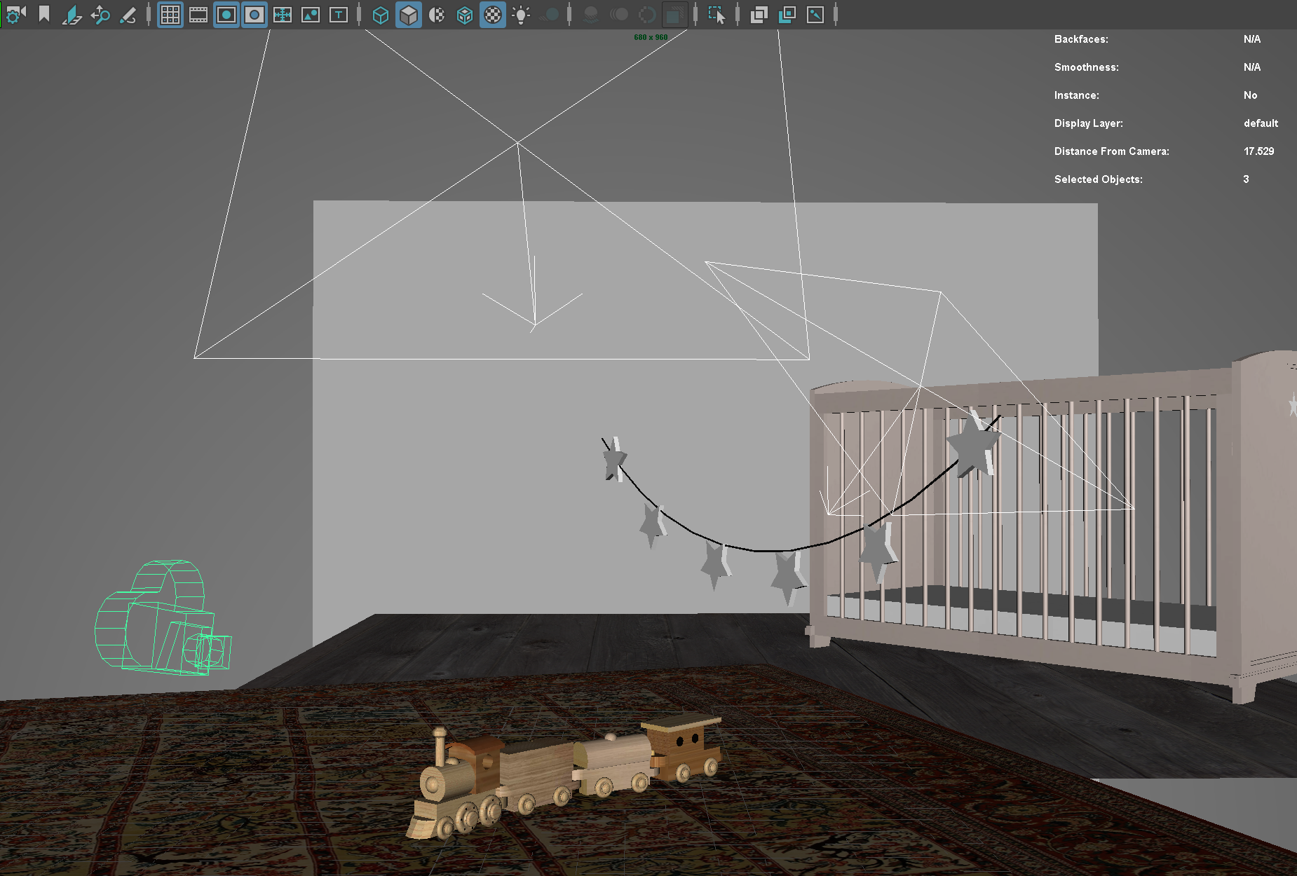 Zur Grundbeleuchtung verwenden wir zwei VRayLightRects. Das erste mit einer Intensität von 1.8 Watt und einer blauen Lichtfarbe wird oberhalb der Szene positioniert und in Richtung der Wand orientiert. Damit soll ein Licht ähnlich einem Mondlicht, das durch ein Fenster fällt, simuliert werden. Das zweite Licht wird rechts oberhalb des Zuges positioniert und mit einem weißen Licht von 4500 Kelvin bei 1.0 Watt Intensität auf das Spielzeug gerichtet. Die Lichterkette zwischen Zug und Bettchen besteht aus sechs Sternen, die jeweils angewählt und mit dem Befehl Create | V-Ray > Mesh Lights > Turn selection into lights zu einer eigenen Lichtquelle umgewandelt werden.