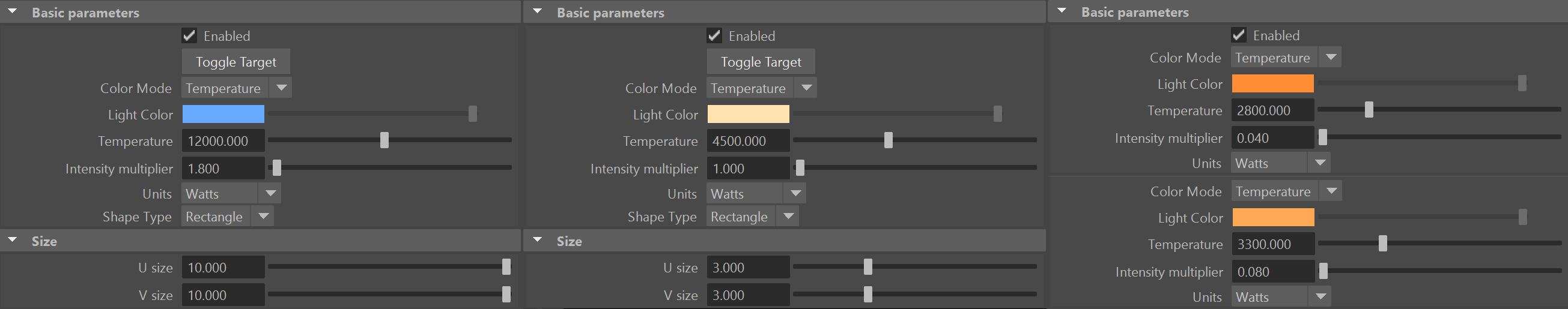 Alle sechs Light Meshes erhalten einen warmweißen Farbton um 3000 Kelvin mit Intensitäten zwischen 0.04 und 0.09 Watt. Leichte Unterschiede in Intensität und Farbe erzeugen beim Rendering dann eine realistisch wirkende Unregelmäßigkeit. Um Rauschen zu minimieren, werden für alle Lichtquellen die Sampling-Raten auf 16 Subdivs pro Lichtquelle erhöht.