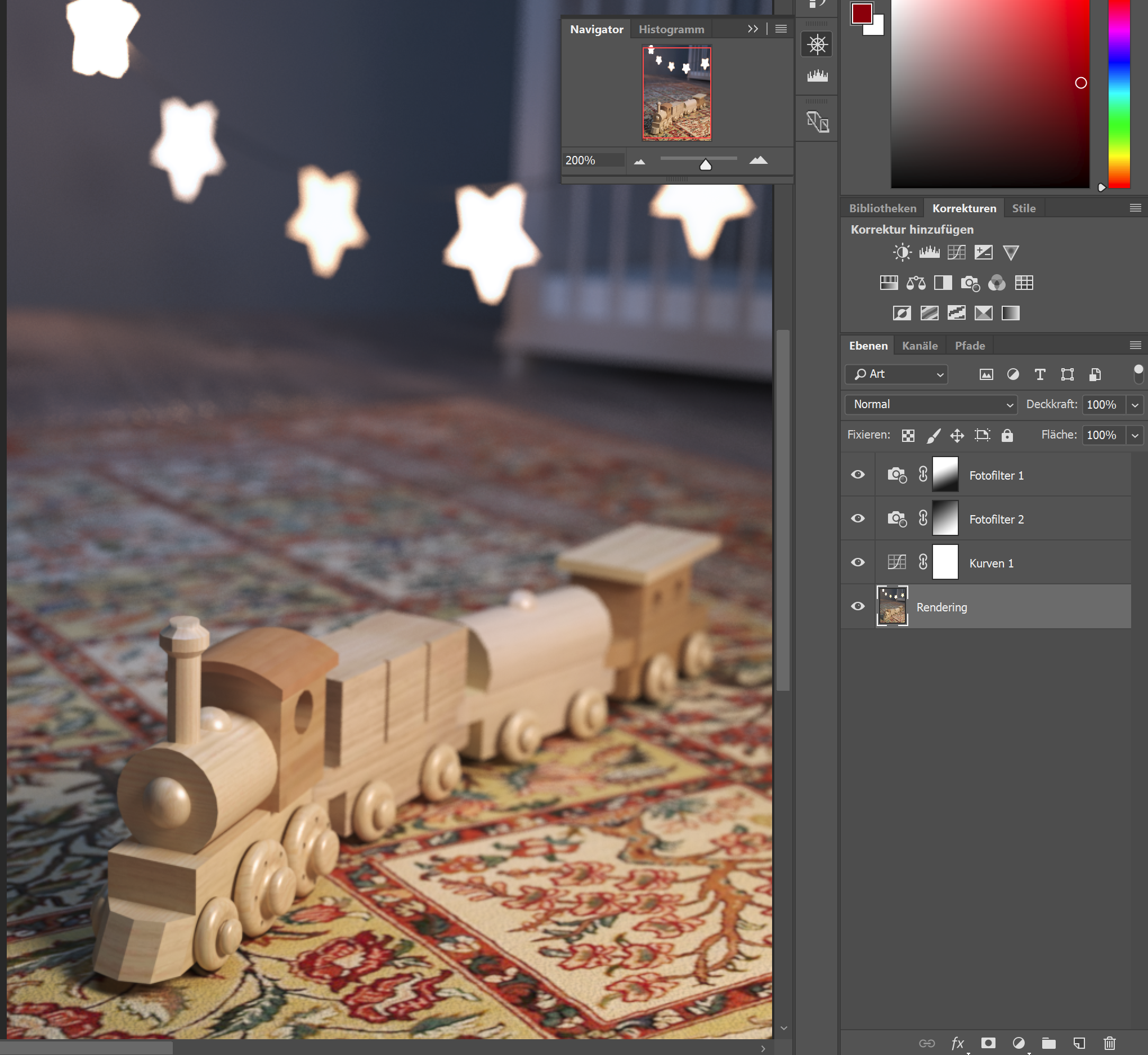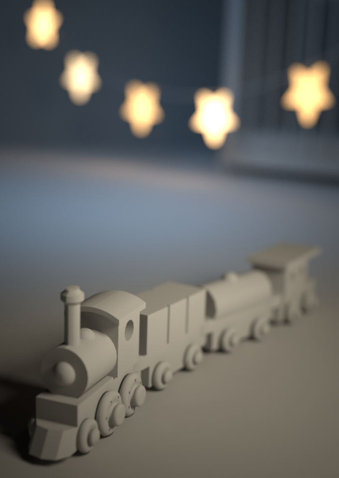 Und da sind natürlich die drei Grundelemente des Renderings Shading, Lighting und Camera zu nennen, die zusammenspielen und das finale Ergebnis ausmachen. Als Besonderheit in V-Ray für die Beleuchtung soll das VRayLightMesh verwendet werden, das vorhandene Geometrie in eine Lichtquelle umwandelt. Für die Kamera sollen reale Werte einer Spiegelreflexkamera verwendet werden. Besonderheit hier ist der Tiefenschärfe-Effekt, der die Lokomotive des Zugs scharf fokussiert und den Rest des Zuges allmählich in Unschärfe tauchen lässt. Der Rest des Zimmers inklusive Bett und einer angeschalteten Lichterkette liegt dann vollständig im Unschärfebereich.
