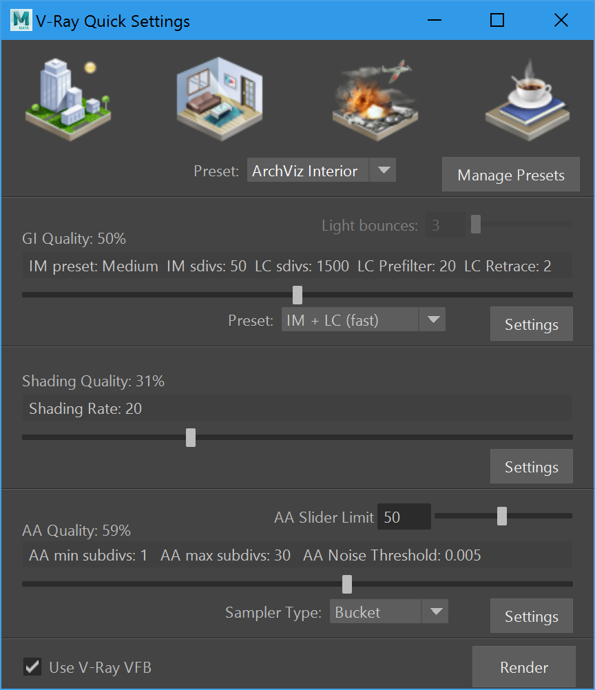 Zur Verbesserung der Render-Qualität verwenden wir der Einfachheit halber den V-Ray Quick Settings-Dialog, der seit V-Ray 3 als Button weit rechts im Shelf VRay zu finden ist. Wir erhöhen die GI Quality auf 50%, die Shading Quality auf etwa 30% und die Anti Aliasing-Quality auf etwa 60% und rendern mit diesen Einstellungen das finale Bild.