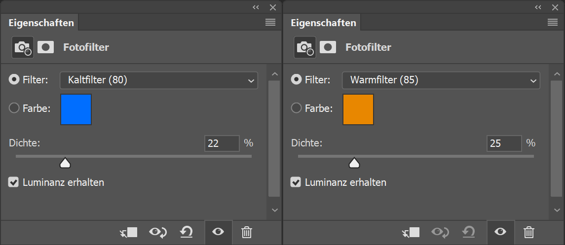 Die beiden unterschiedlichen Farbstimmungen mit blauem Licht im oberen Teil und warmweißen licht im unteren Teil des Rendering unterstützen wird durch jeweils auf entsprechenden Masken angewendete Fotofilter Kaltfilter (80) und Warmfilter (85) mit jeweils 22% und 25% Dichte.